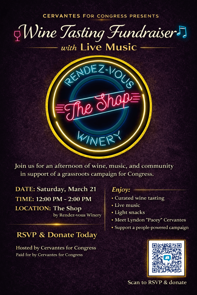 Join us for an afternoon of wine, music, and community in support of a grassroots campaign for Congress. Enjoy curated wine tasting, live music, light snacks, and meet Lyndon “Pacey” Cervantes.